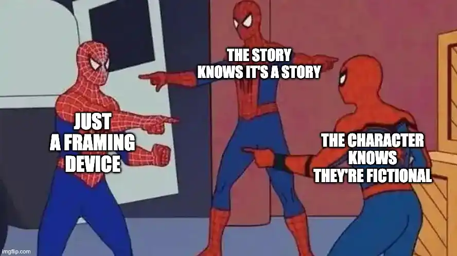 Stories about prophecy, destiny, or “chosen ones” often flirt with similar ideas, but they don’t automatically cross into metafiction. In most cases, fate operates as an in-world force, not as a narrative constraint the characters recognize as artificial. Metafiction is when characters explicitly recognize narrative rules as constraints imposed by an authorial hand, not the circumstances of their world or a divine being from within the story.